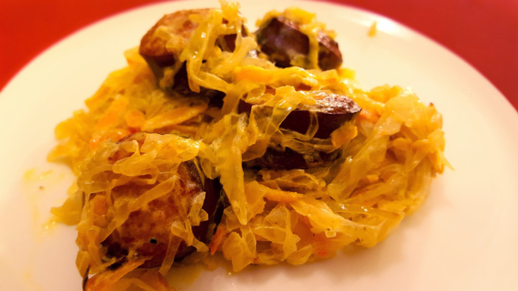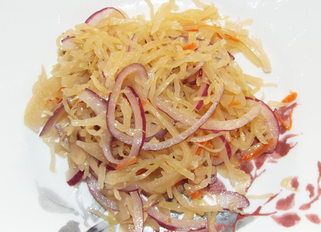 recipe This simple salad calls just for four ingredients – homemade sauerkraut, red onion, unrefined olive oil, pinch of salt.